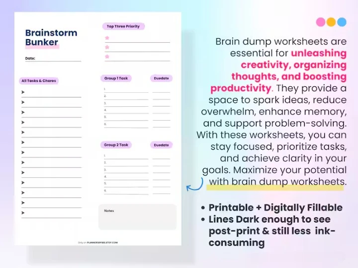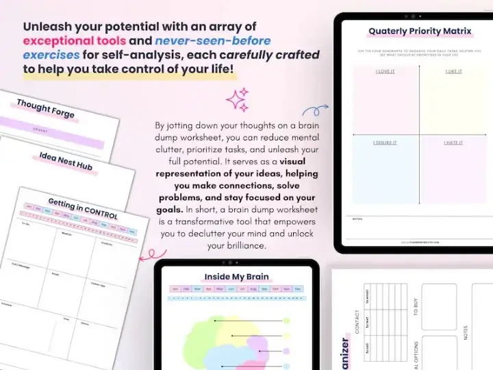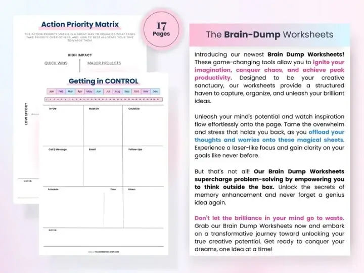This planner helps you brain dump thoughts, organize priorities, and translate ideas into action so you can focus on what truly matters without the stress of scattered thinking. A brain dump isn’t just a list — it’s a productivity reset that helps clear your mental workspace and increase clarity.