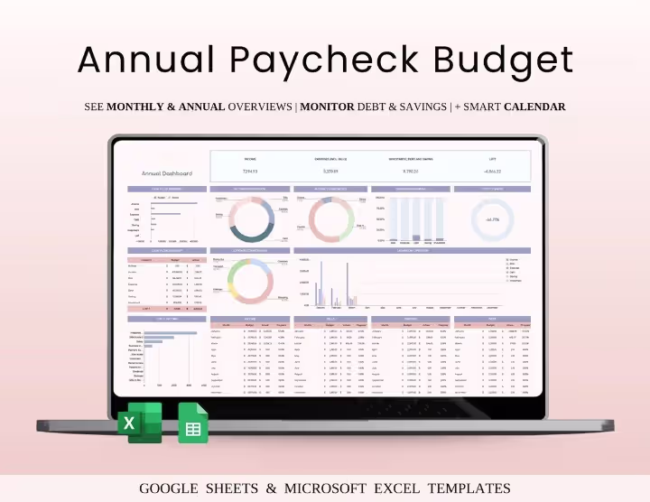 Take full control of your finances with this Annual Paycheck Budget Spreadsheet for Excel & Google Sheets. Features income tracking, expense categorization, debt management, financial forecasting & automated calculations. Perfect for salaried employees, freelancers & multiple income earners.