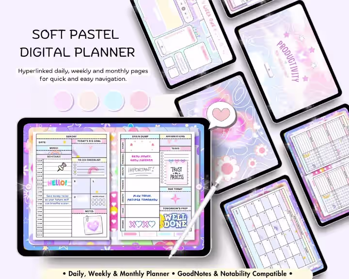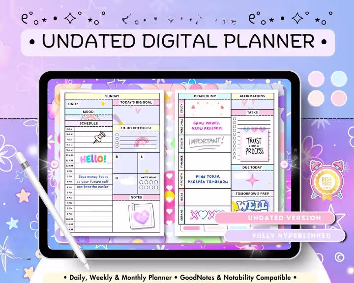 Stay organized with this Digital Planner! Hyperlinked PDF for GoodNotes & Notability. Includes daily, weekly, monthly planning plus wellness, finance & productivity trackers. Instant download.