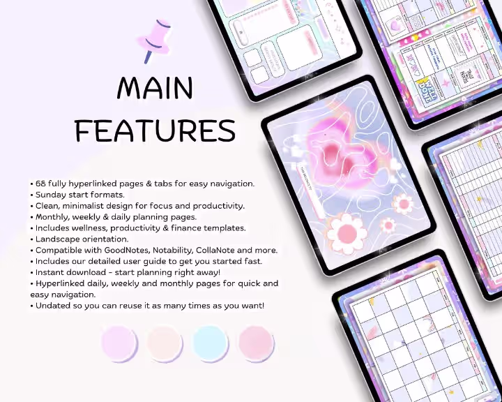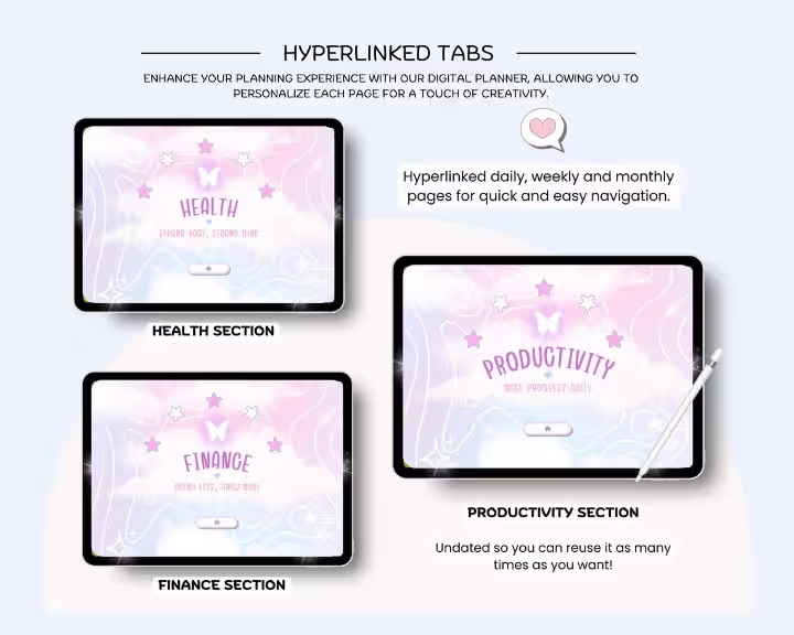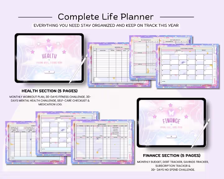 This Digital Planner (Hyperlinked, Undated) is designed to help you manage every aspect of your life—planning, wellness, productivity, and finances—all in one sleek, easy‑to‑use PDF. With smooth navigation, pastel‑inspired layouts, and powerful trackers, it’s the perfect tool for students, professionals, and anyone who wants to stay balanced and productive.
