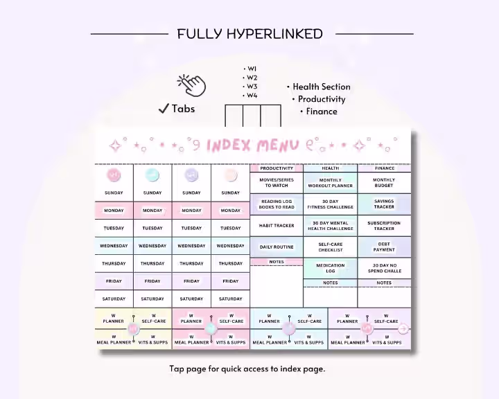 - 1 × Horizontal planner (11″ × 8.3″) with ~68 hyperlinked pages