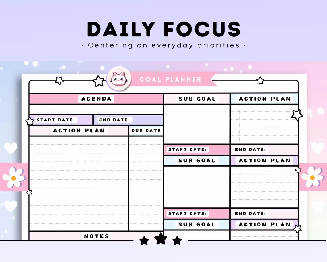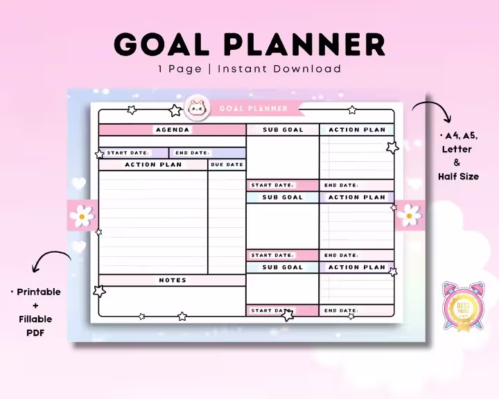 Designed with a simple and cute layout, this undated planner is perfect for anyone who wants to plan their life with clarity and focus. Whether you’re working on personal growth, career milestones, or daily productivity, this planner helps you break down big dreams into actionable steps.