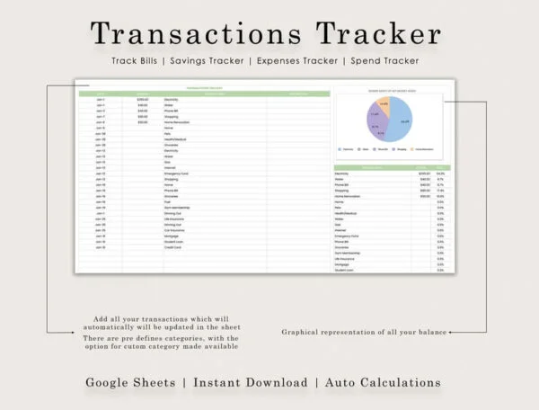 ✓ Transactions tracker (by categories: shopping, food, utilities, groceries, etc)