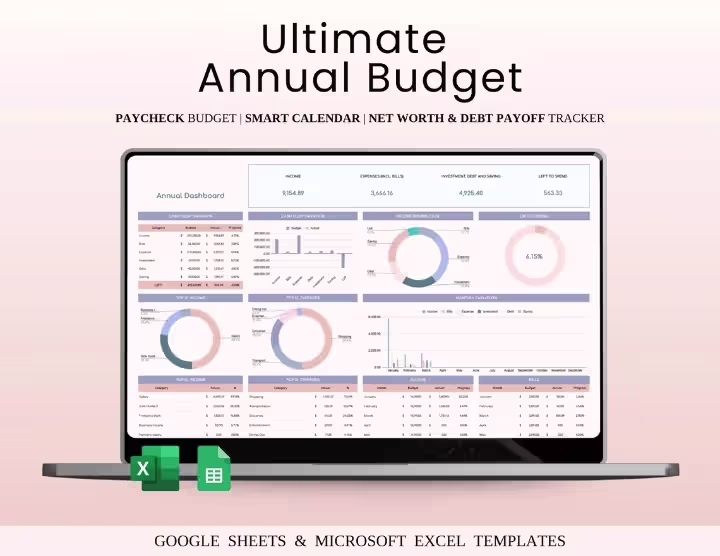 Plan your entire year with the Ultimate Annual Budget Spreadsheet for Excel & Google Sheets. Features annual overview, income & expense tracking, automated calculations, savings goals & end-of-year financial reports. Perfect for individuals, families & small businesses.